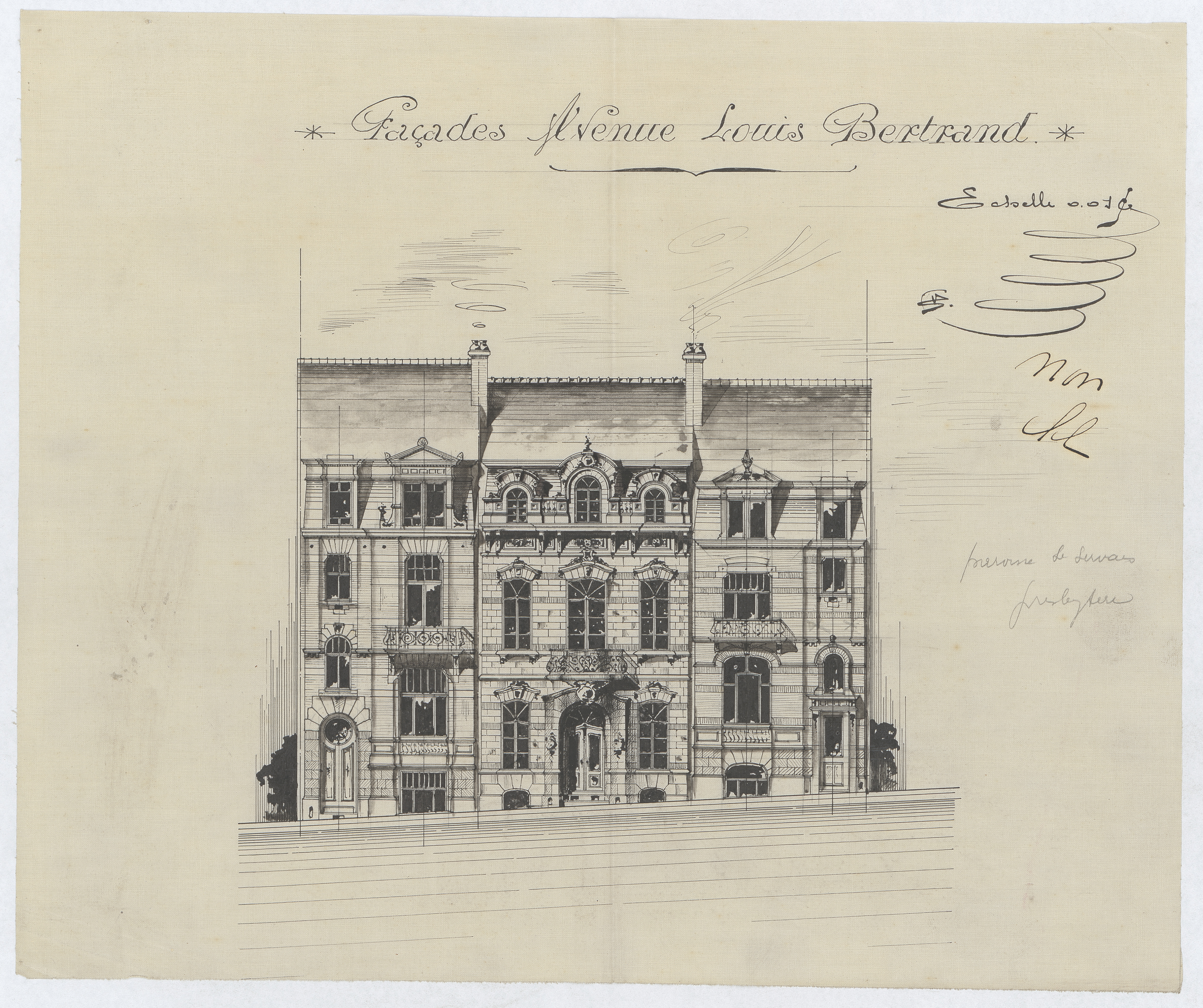 Opschrift: Façades Avenue Louis Bertrand. Omschrijving plan: opstand voorgevels Datum KCML: deze informatie wordt niet vermeld op het archiefstuk Archiefnummer: B1846