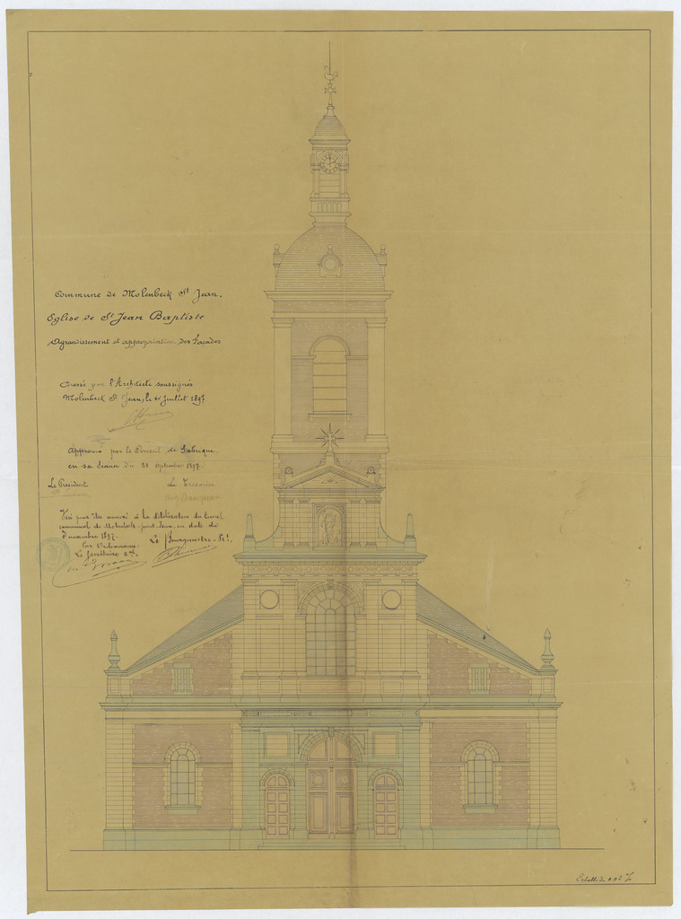 Opschrift: Commune de Molenbeek St. Jean. Eglise paroissiale de Saint Jean-Baptiste. Agrandissement et appropriation des Façades. Omschrijving plan: opstand voorgevel Datum KCML: deze informatie wordt niet vermeld op het archiefstuk Archiefnummer: B1884