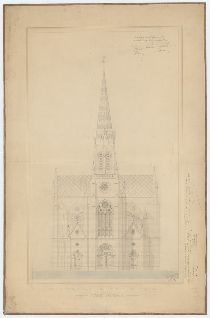 Opschrift: Projet de reconstruction de l'église Saint Servais à Schaerbeek. Omschrijving plan: opstand voorgevel Datum KCML: 19/01/1867 Archiefnummer: B1825