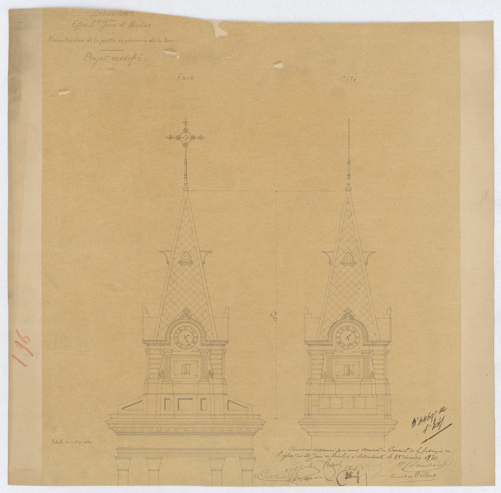 Opschrift: Schaerbeek. Eglise Ste. Jean et Nicolas. Reconstruction de la partie supérieure de la tour. Projet modifié. Omschrijving plan: opstand toren Datum KCML: 01/01/1870 Archiefnummer: B1811