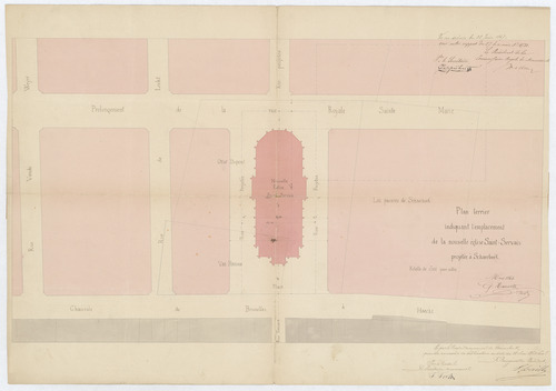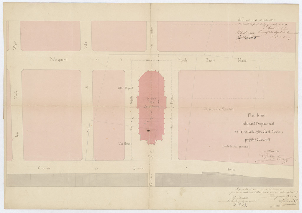 Opschrift: Plan terrier indiquant l'emplacement de la nouvelle église Saint-Servais projetée à Schaerbeek. Omschrijving plan: situatieplan Datum KCML: 22/06/1867 Archiefnummer: B1822
