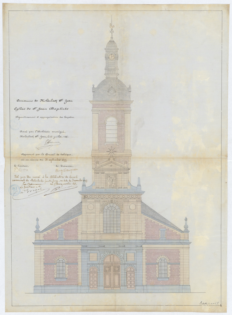 Opschrift: Commune de Molenbeek St. Jean. Eglise paroissiale de Saint Jean-Baptiste. Agrandissement et appropriation des Façades Omschrijving plan: opstand voorgevel Datum KCML: deze informatie wordt niet vermeld op het archiefstuk Archiefnummer: B1890