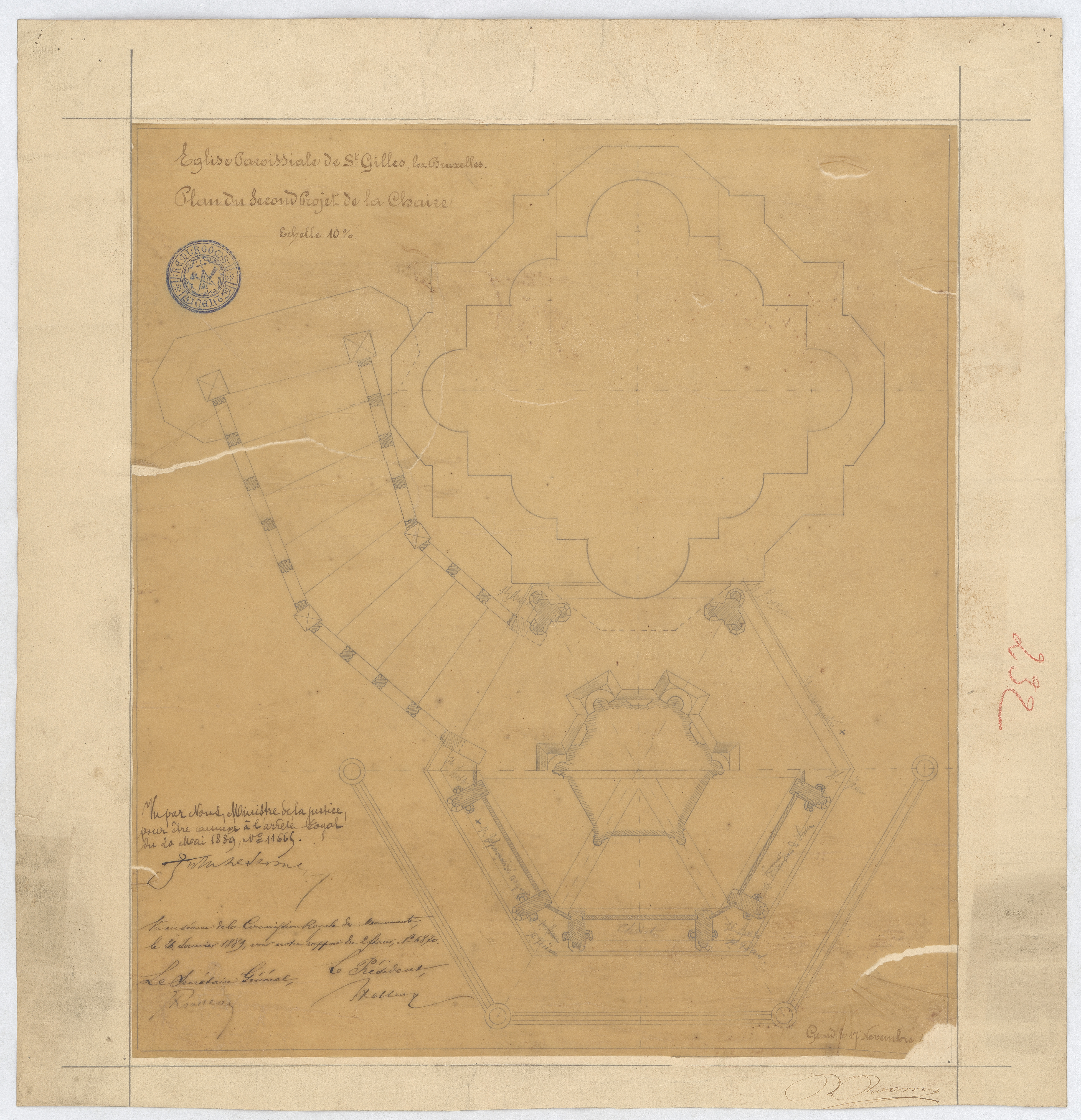 Opschrift: Eglise Paroissiale de St. Gilles lez Bruxelles. Plan du Second Projet de la Chaîre. Omschrijving plan: plattegrond preekstoel Datum KCML: 26/01/1889 Archiefnummer: B1869