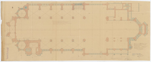 Opschrift: Commune de Molenbeek St. Jean. Construction de la Nouvelle Eglise paroissiale de Saint Remi. Coupe horizontale au dessus des chapitaux des basses nefs. Omschrijving plan: plattegrond niveau 1, ter hoogte kapitelen Datum KCML: 14/07/1906 Archiefnummer: B1898