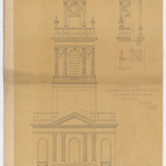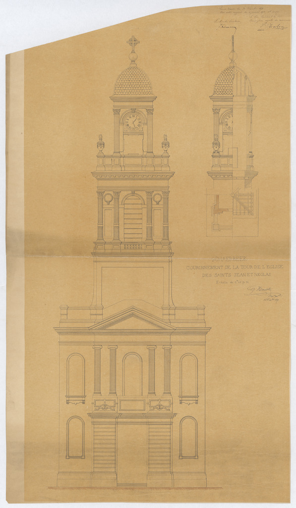 Opschrift: Schaerbeek. Couronnement de la tour de l'église des Saints Jean et Nicolas. Omschrijving plan: opstand voorgevel, doorsnede toren Datum KCML: 30/12/1871 Archiefnummer: B1812