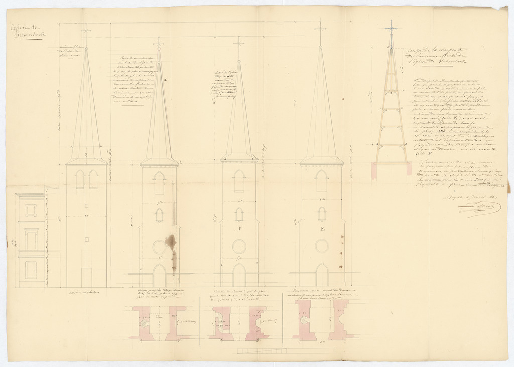 Opschrift: Eglise de Schaerbeek Omschrijving plan: opstand voorgevel, opstand en plattegrond toren Datum KCML: deze informatie wordt niet vermeld op het archiefstuk Archiefnummer: B1821