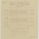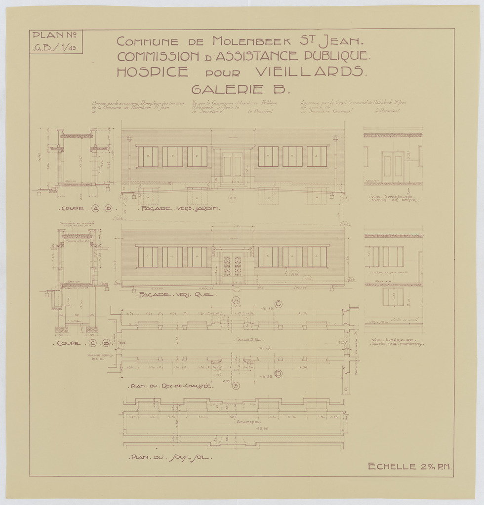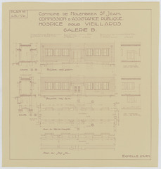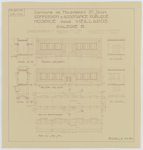 Opschrift: Commune de Molenbeek St. Jean. Commission d'Assistance Publique. Hospice pour veillards. Galerie B. Omschrijving plan: plattegrond, aanzicht en doorsnede galerij Datum KCML: deze informatie wordt niet vermeld op het archiefstuk Archiefnummer: B1959