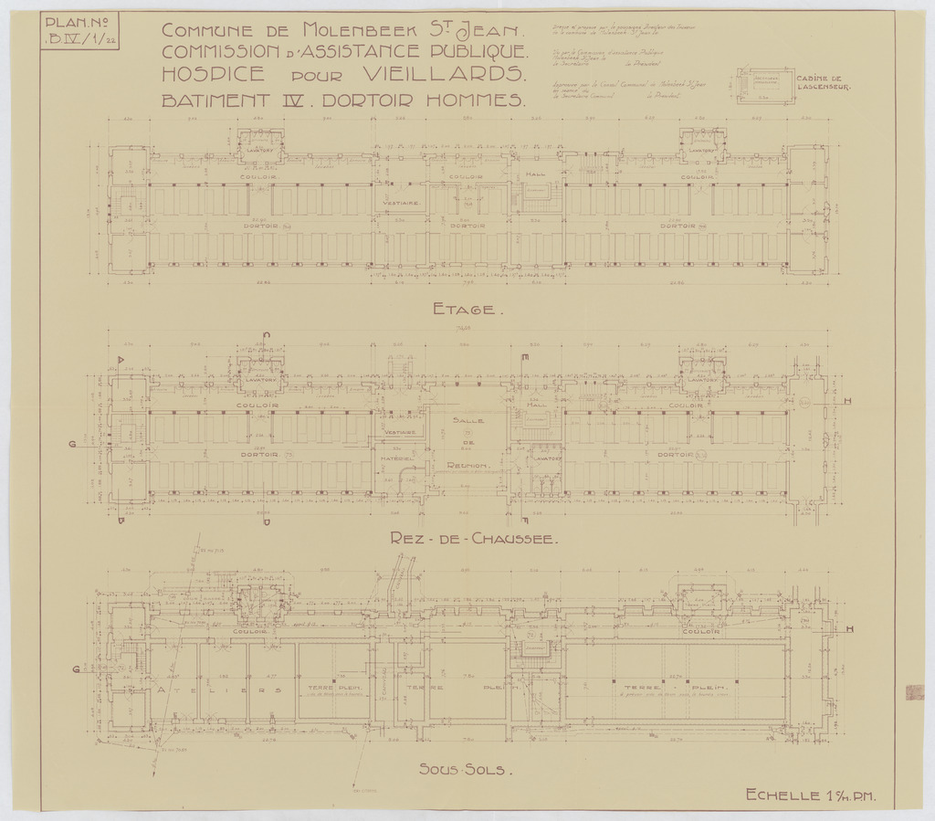 Opschrift: Commune de Molenbeek St. Jean. Commission d'Assistance Publique. Hospice pour veillards. Bâtiment IV. Dortoir hommes. Omschrijving plan: plattegrond niveau 0, plattegrond niveau 1, plattegrond niveau -1 Datum KCML: deze informatie wordt niet vermeld op het archiefstuk Archiefnummer: B1935