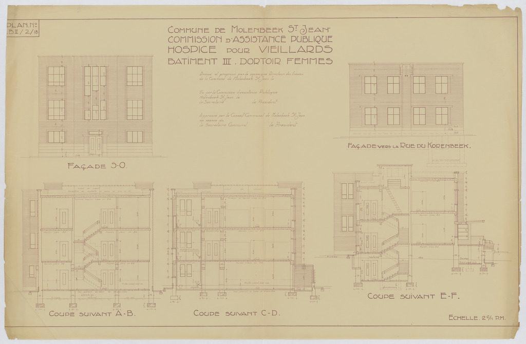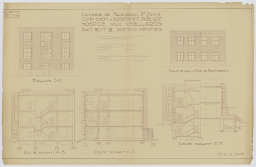 Opschrift: Commune de Molenbeek St. Jean. Commission d'Assistance Publique. Hospice pour veillards. Bâtiment III. Dortoir des femmes. Omschrijving plan: opstand gevels, doorsneden Datum KCML: deze informatie wordt niet vermeld op het archiefstuk Archiefnummer: B1931