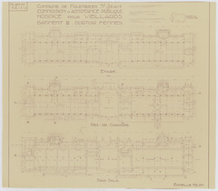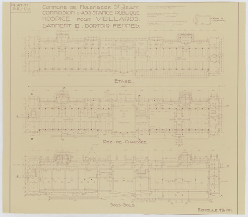 Opschrift: Commune de Molenbeek St. Jean. Commission d'Assistance Publique. Hospice pour veillards. Bâtiment III. Dortoir des femmes. Omschrijving plan: plattegrond niveau 0, plattegrond niveau -1, plattegrond niveau 1 Datum KCML: deze informatie wordt niet vermeld op het archiefstuk Archiefnummer: B1930