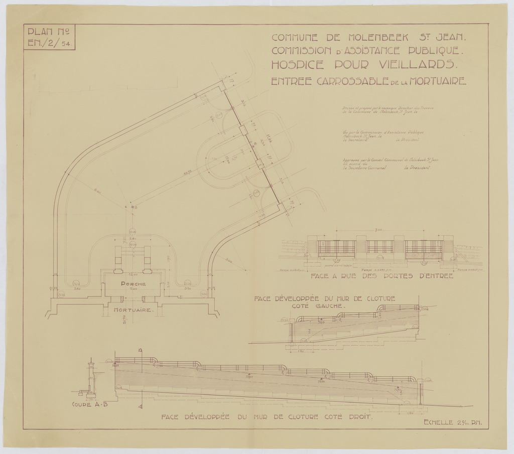 Opschrift: Commune de Molenbeek St. Jean. Commission d'Assistance Publique. Hospice pour veillards. Entrée carrossable des services généraux. Omschrijving plan: plattegrond niveau 0, aanzicht omheinigsmuur Datum KCML: deze informatie wordt niet vermeld op het archiefstuk Archiefnummer: B1956