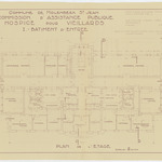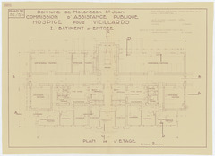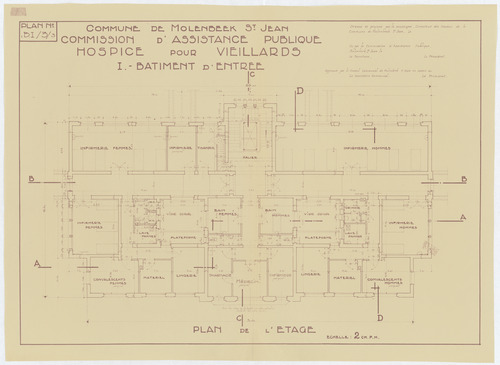 Opschrift: Commune de Molenbeek St. Jean. Commission d'Assistance Publique. Hospice pour veillards. I.-Bâtiment d'entrée. Omschrijving plan: plattegrond niveau 1 Datum KCML: deze informatie wordt niet vermeld op het archiefstuk Archiefnummer: B1919