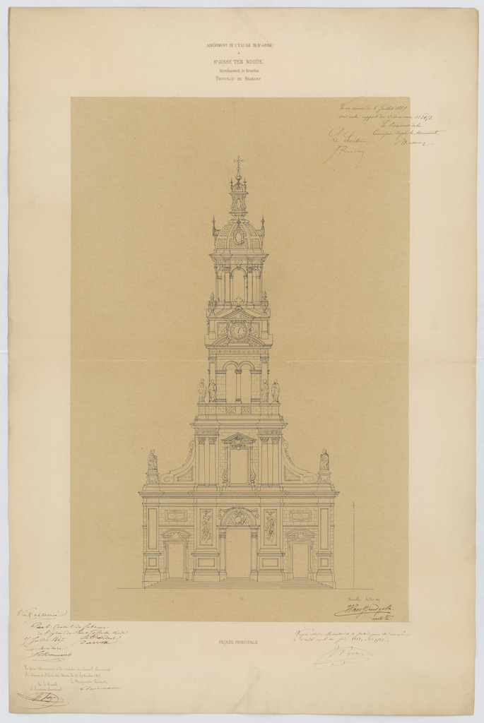 Opschrift: Achèvement de l'église de St. Josse. à St.-Josse-ten Noode. Arrondissement de Bruxelles. Province de Brabant. Omschrijving plan: opstand voorgevel Datum KCML: 6 /07/1867 Archiefnummer: B1974