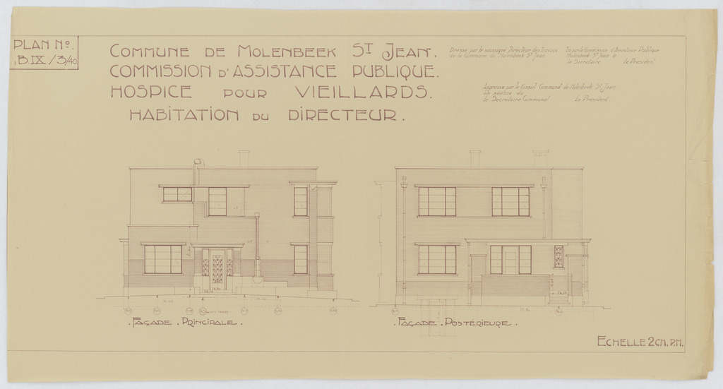 Opschrift: Commune de Molenbeek St. Jean. Commission d'Assistance Publique. Hospice pour veillards. Habitation du directeur. Omschrijving plan: opstand voorgevel, opstand achtergevel Datum KCML: deze informatie wordt niet vermeld op het archiefstuk Archiefnummer: B1953