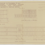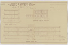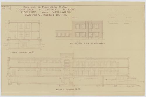 Opschrift: Commune de Molenbeek St. Jean. Commission d'Assistance Publique. Hospice pour veillards. Bâtiment V. Dortoir hommes. Omschrijving plan: opstand gevel, doorsneden Datum KCML: deze informatie wordt niet vermeld op het archiefstuk Archiefnummer: B1941