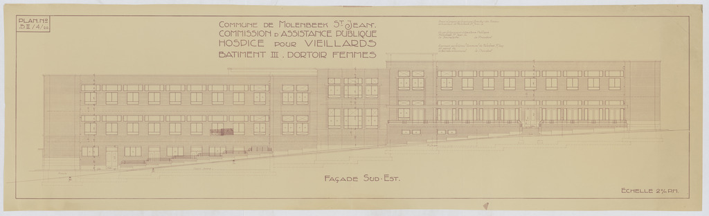 Opschrift: Commune de Molenbeek St. Jean. Commission d'Assistance Publique. Hospice pour veillards. Bâtiment III. Dortoir des femmes. Omschrijving plan: opstand gevel Datum KCML: deze informatie wordt niet vermeld op het archiefstuk Archiefnummer: B1933