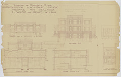 Opschrift: Commune de Molenbeek St. Jean. Commission d'Assistance Publique. Hospice pour veillards. II.-Bâtiment des services généraux. Omschrijving plan: opstand gevels, doorsneden Datum KCML: deze informatie wordt niet vermeld op het archiefstuk Archiefnummer: B1928