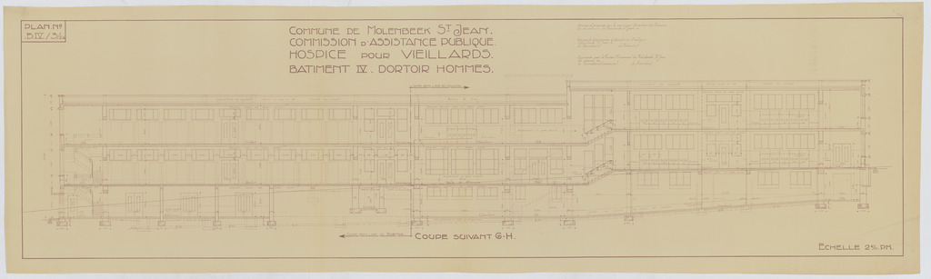 Opschrift: Commune de Molenbeek St. Jean. Commission d'Assistance Publique. Hospice pour veillards. Bâtiment IV. Dortoir hommes. Omschrijving plan: doorsnede Datum KCML: deze informatie wordt niet vermeld op het archiefstuk Archiefnummer: B1937