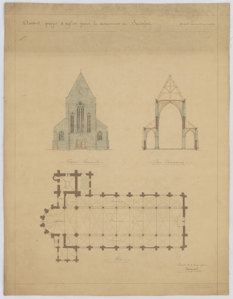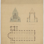 Opschrift: Avant projet d'église pour la commune de Boitsfort. Omschrijving plan: plattegrond niveau 0, opstand voorgevel, dwarsdoorsnede Datum KCML: deze informatie wordt niet vermeld op het archiefstuk Archiefnummer: B2099