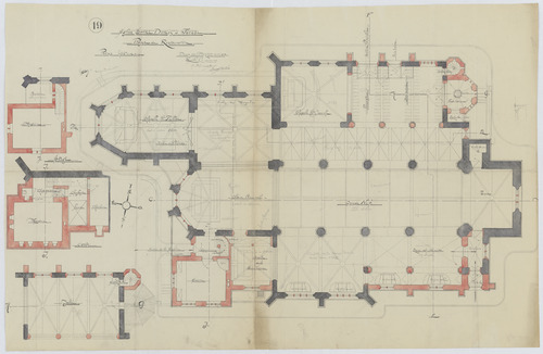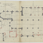 Opschrift: Eglise Saint Denis a Forest. Projet de Restauration. Omschrijving plan: plattegrond niveau 0, plattegrond niveau 1, plattegrond niveau -1 en 1 sacristie Datum KCML: deze informatie wordt niet vermeld op het archiefstuk Archiefnummer: B2079