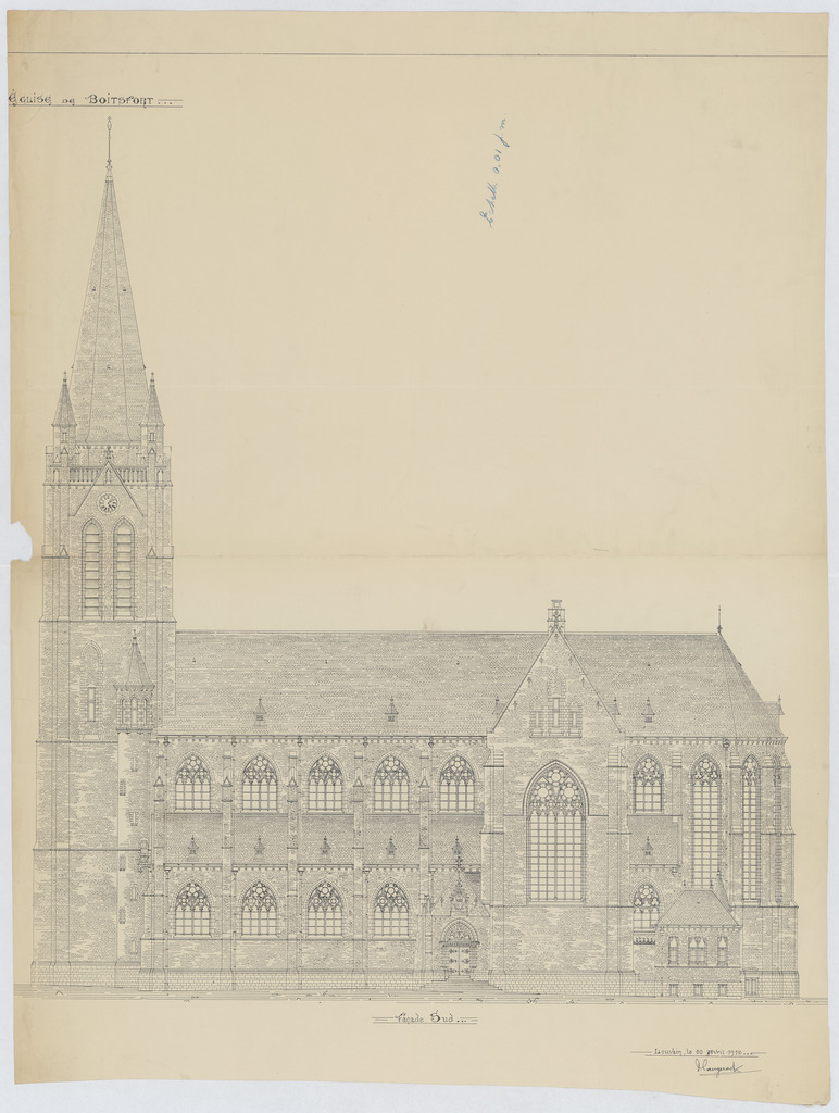 Opschrift: Eglise de Boitsfort. Omschrijving plan: opstand Z-gevel Datum KCML: deze informatie wordt niet vermeld op het archiefstuk Archiefnummer: B2120