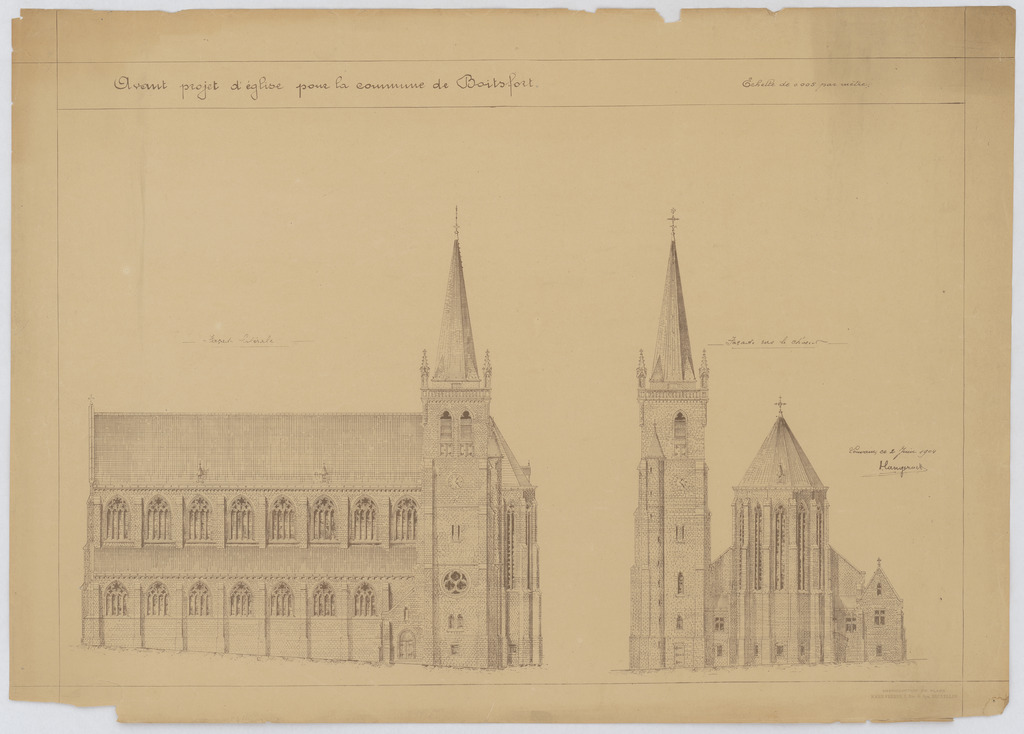 Opschrift: Avant projet d'église pour la commune de Boitsfort. Omschrijving plan: opstand achtergevel, opstand zijgevel Datum KCML: deze informatie wordt niet vermeld op het archiefstuk Archiefnummer: B2100