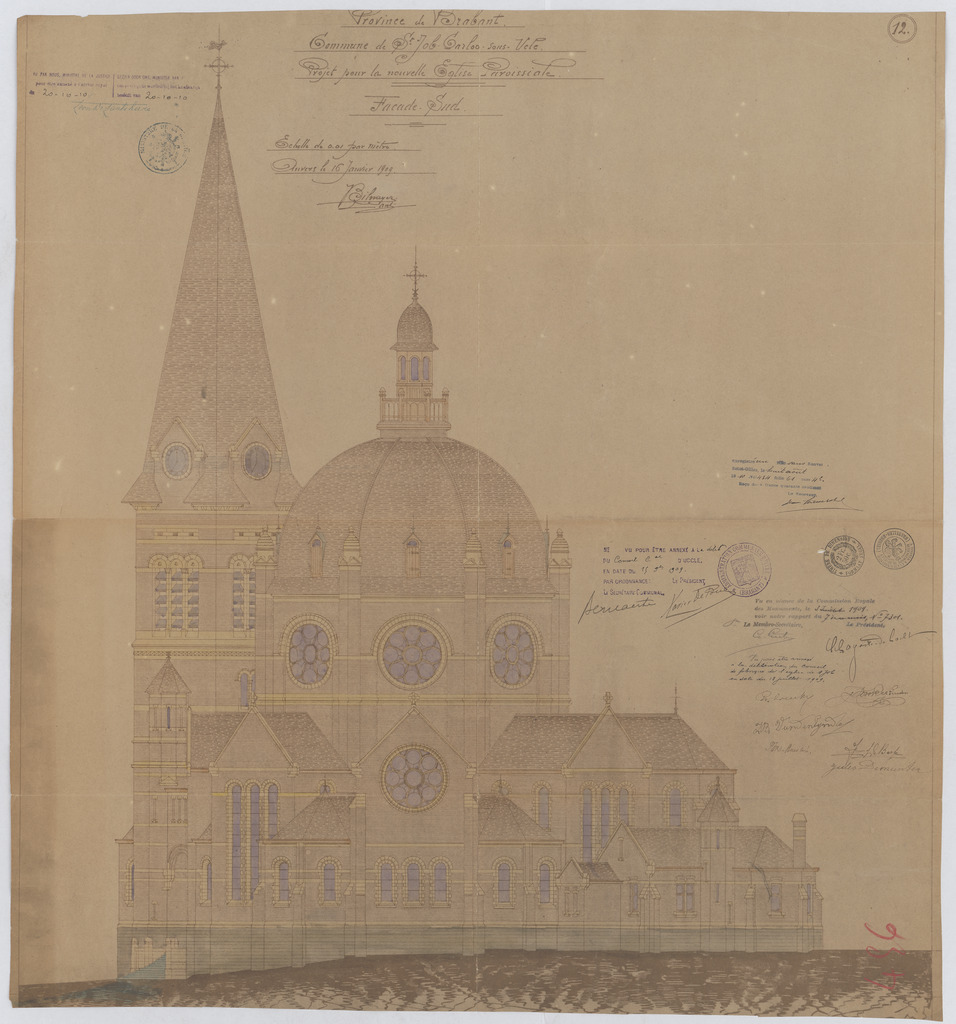 Opschrift: Province de Brabant. Commune de St. Job-Carloo sous Ucle. Projet pour la nouvelle Eglise paroissiale. Façade Sud. Omschrijving plan: opstand Z-gevel Datum KCML: 3-7-1909 Archiefnummer: B2040