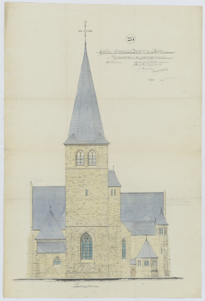 Opschrift: Eglise Saint Denis a Forest. Restauration et agrandissement. Omschrijving plan: opstand W-gevel Datum KCML: deze informatie wordt niet vermeld op het archiefstuk Archiefnummer: B2086