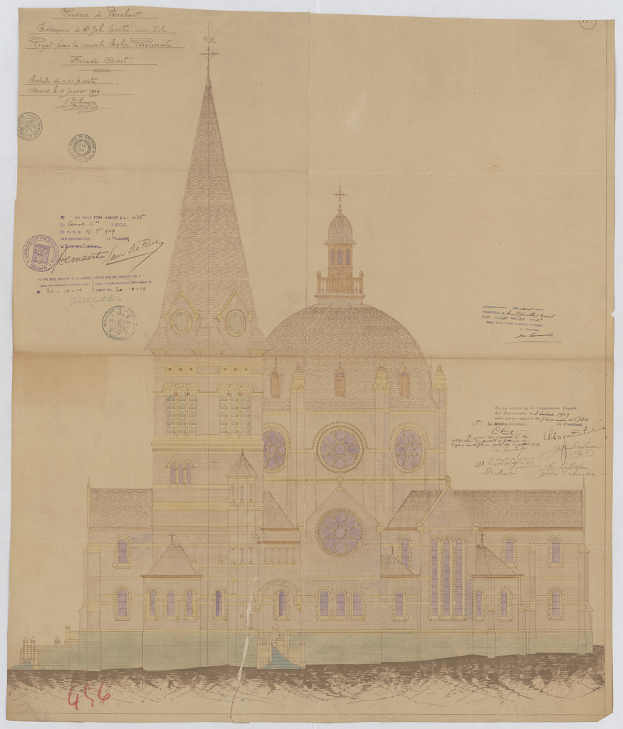 Opschrift: Province de Brabant. Commune de St. Job-Carloo sous Ucle. Projet pour la nouvelle Eglise paroissiale. Façade Ouest. Omschrijving plan: opstand W-gevel Datum KCML: 3-7-1909 Archiefnummer: B2039