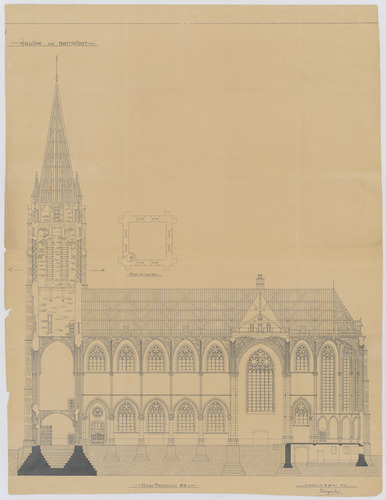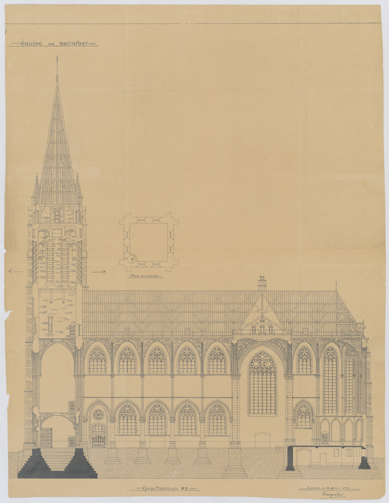 Opschrift: Eglise de Boitsfort. Omschrijving plan: langsdoorsnede, plattegrond toren Datum KCML: deze informatie wordt niet vermeld op het archiefstuk Archiefnummer: B2124