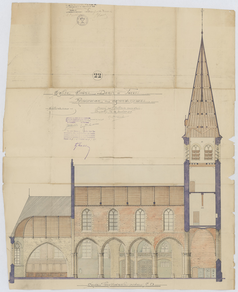 Opschrift: Eglise Saint Denis a Forest. Restauration et agrandissement. Omschrijving plan: langsdoorsnede Datum KCML: 22/06/1918 Archiefnummer: B2092