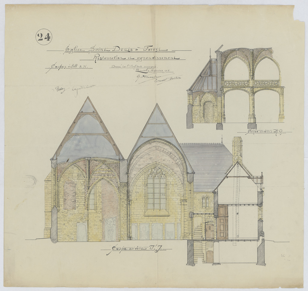 Opschrift: Eglise Saint Denis a Forest. Restauration et agrandissement. Omschrijving plan: doorsneden Datum KCML: deze informatie wordt niet vermeld op het archiefstuk Archiefnummer: B2085