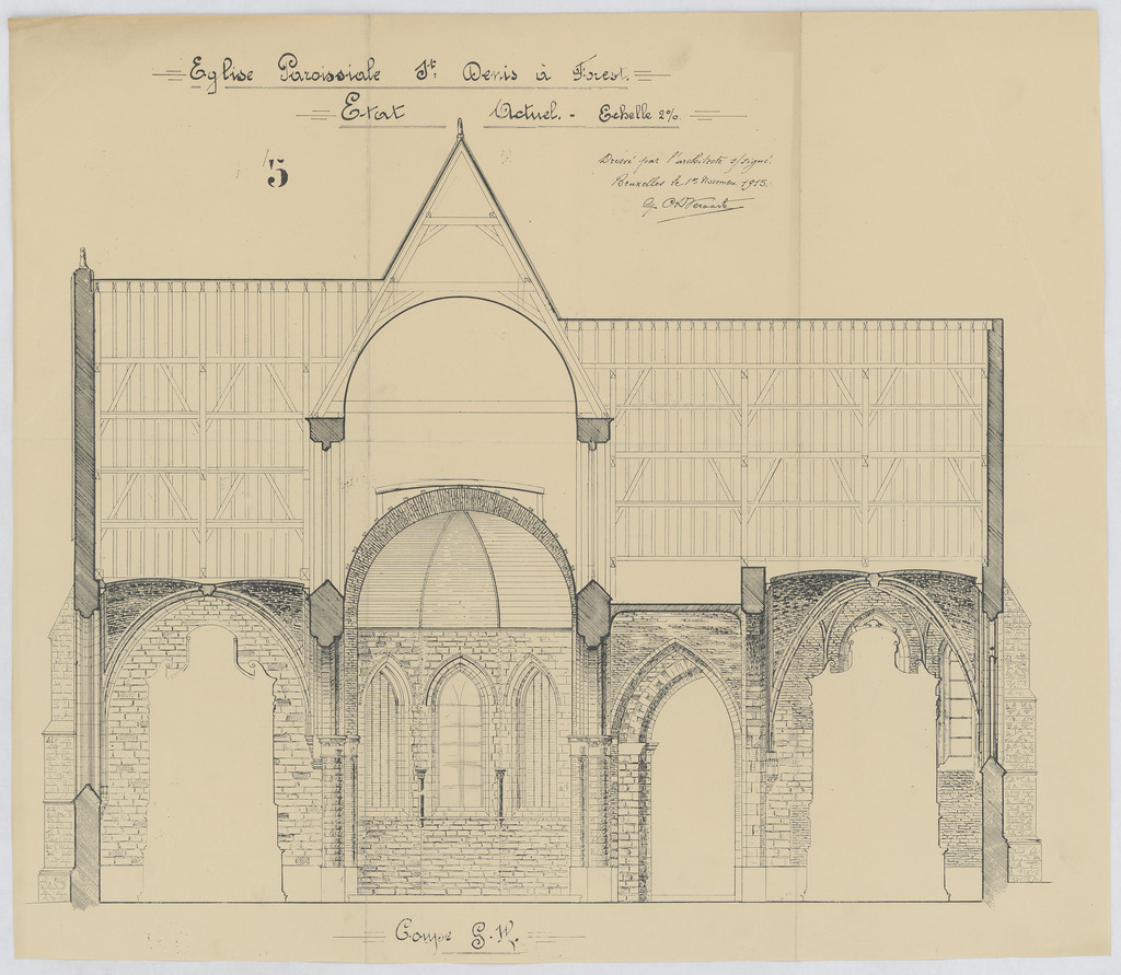 Opschrift: Eglise Paroissiale St. Denis a Forest. Plan de l'Etat Actuel. Omschrijving plan: dwarsdoorsnede Datum KCML: deze informatie wordt niet vermeld op het archiefstuk Archiefnummer: B2074