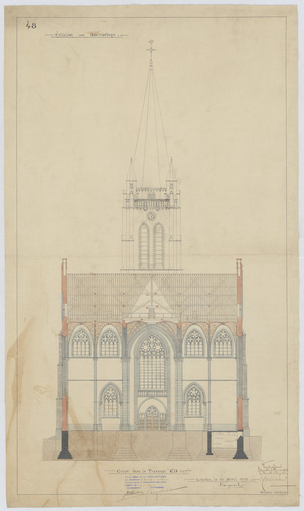 Opschrift: Eglise de Boitsfort. Omschrijving plan: dwarsdoorsnede, dwarsdoorsnede naar portaal Datum KCML: 16/05/1912 Archiefnummer: B2132