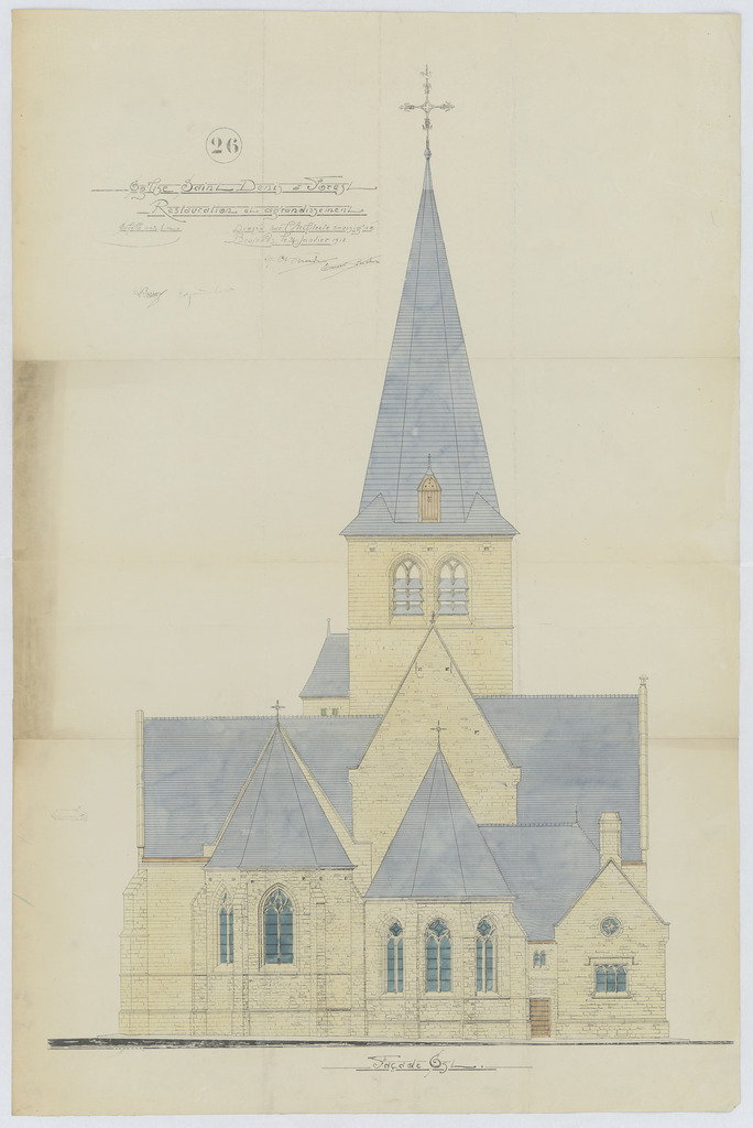 Opschrift: Eglise Saint Denis a Forest. Restauration et agrandissement. Omschrijving plan: opstand O-gevel Datum KCML: deze informatie wordt niet vermeld op het archiefstuk Archiefnummer: B2087