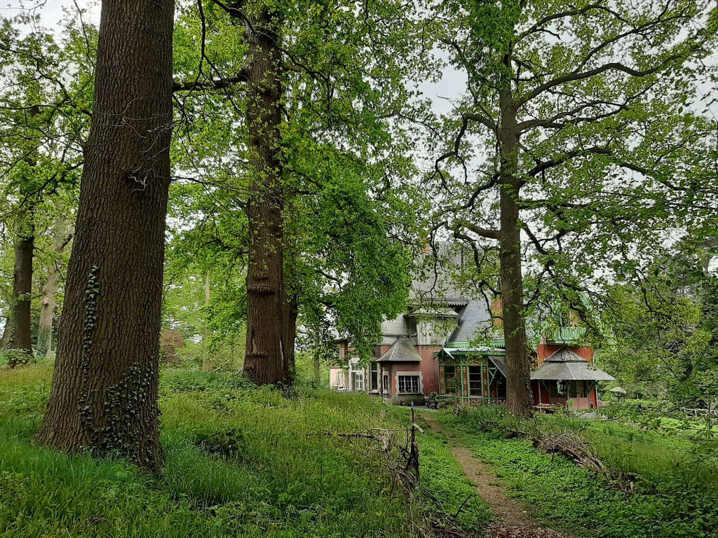 Zicht op de achter- en oostgevel van villa Louisa. Bomenrij begeleidt het pad in het zuidelijke parkgedeelte.