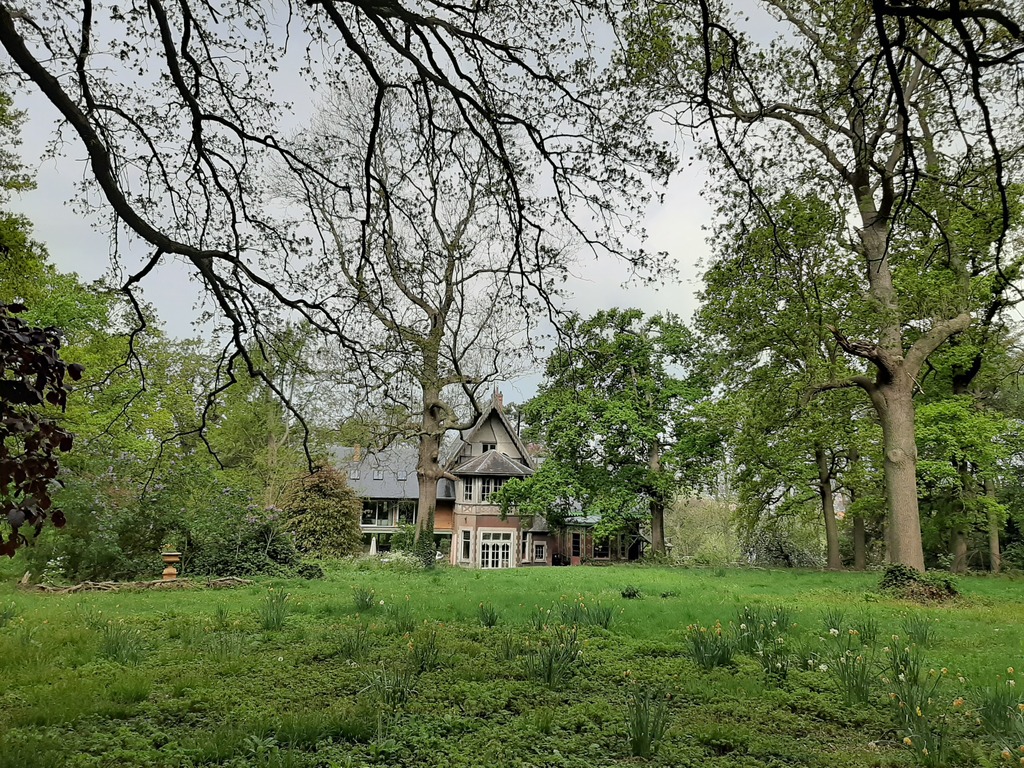 Zicht vanaf de rondgang in het zuidelijke parkgedeelte op de achtergevel van villa Louisa.