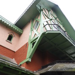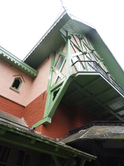Overkragende houten bovenbouw van hetmiddenste gedeelte in de voorgevel bij villa Louisa