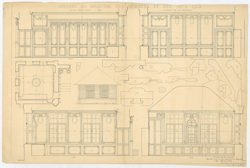 Opschrift: Mission du Ministère des Sciences et des Arts - 1915 - Eglise Saint Pierre à Loo. Lambris de la sacristie. Omschrijving plan: lambrisering, plattegrond en gevel sacristie, profielen Archiefnummer: MD042a