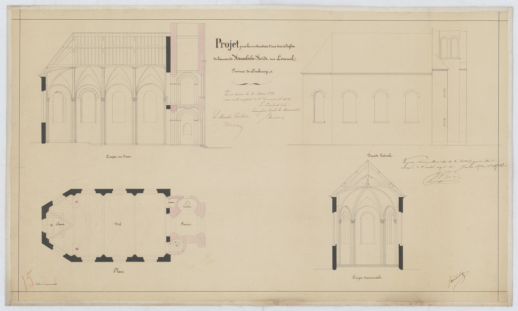 Opschrift: Projet pour la construction d'une tour à l'église du hameau de Heuvelsche-heide sous Lommel Omschrijving plan: langsdoorsnede, grondplan, opstand N-gevel, dwarsdoorsnede Datum KCML: 26/02/1867 Archiefnummer: L0604