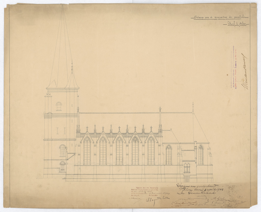Opschrift: ontwerp voor de vergrooting der parochiale kerk te Bilzen Omschrijving plan: opstand zijgevel Datum KCML: 18-07-1903 Archiefnummer: L0078