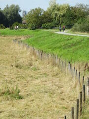 Dijk langs de Dijle, met de Sint-Rombouts toren van Mechelen in de achtergrond.