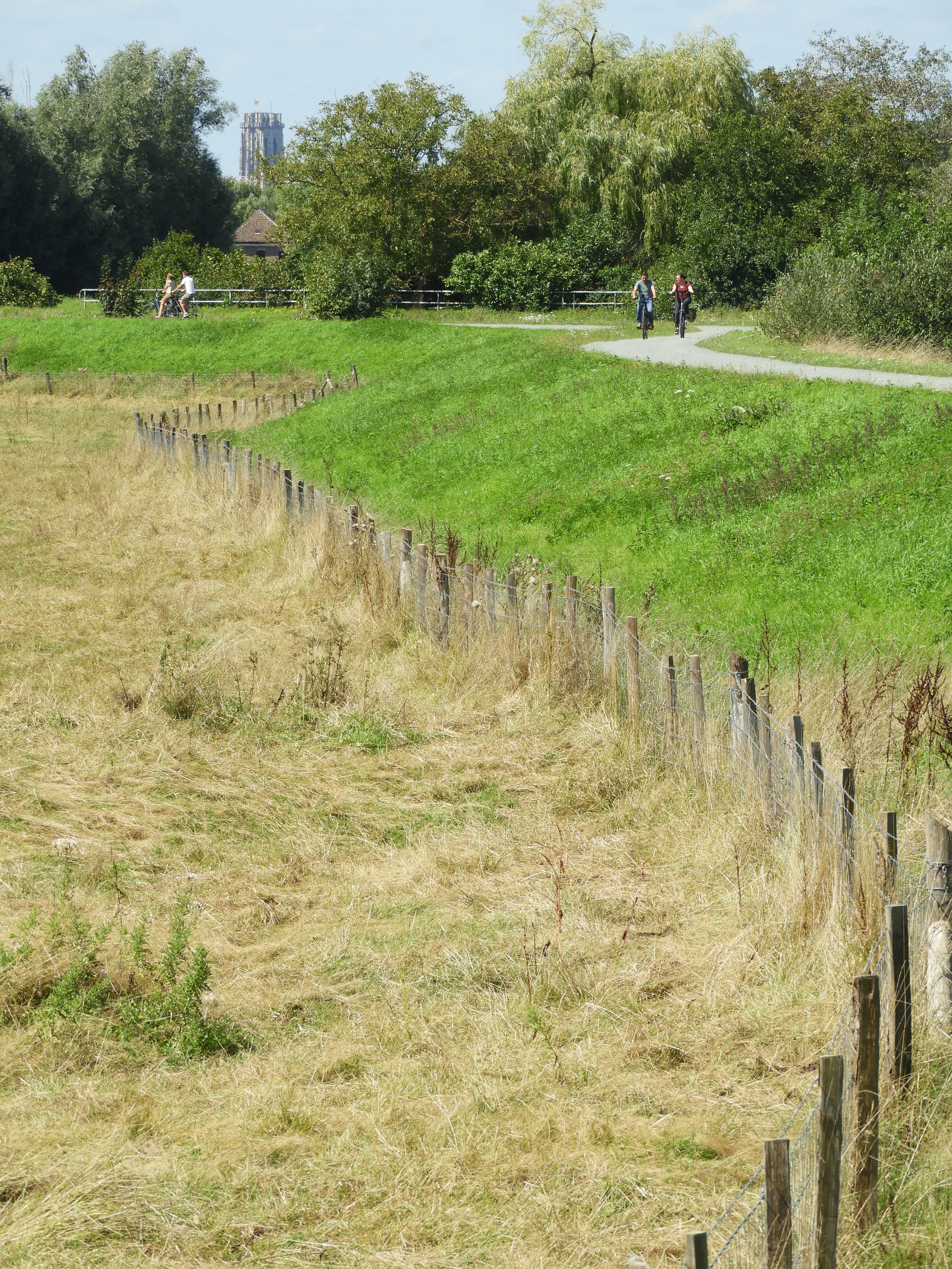 Dijk langs de Dijle, met de Sint-Rombouts toren van Mechelen in de achtergrond.