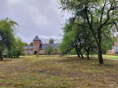 Boomgaard van appelaars en pruimelaars in de tuin naast het voormalige neerhof