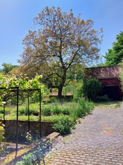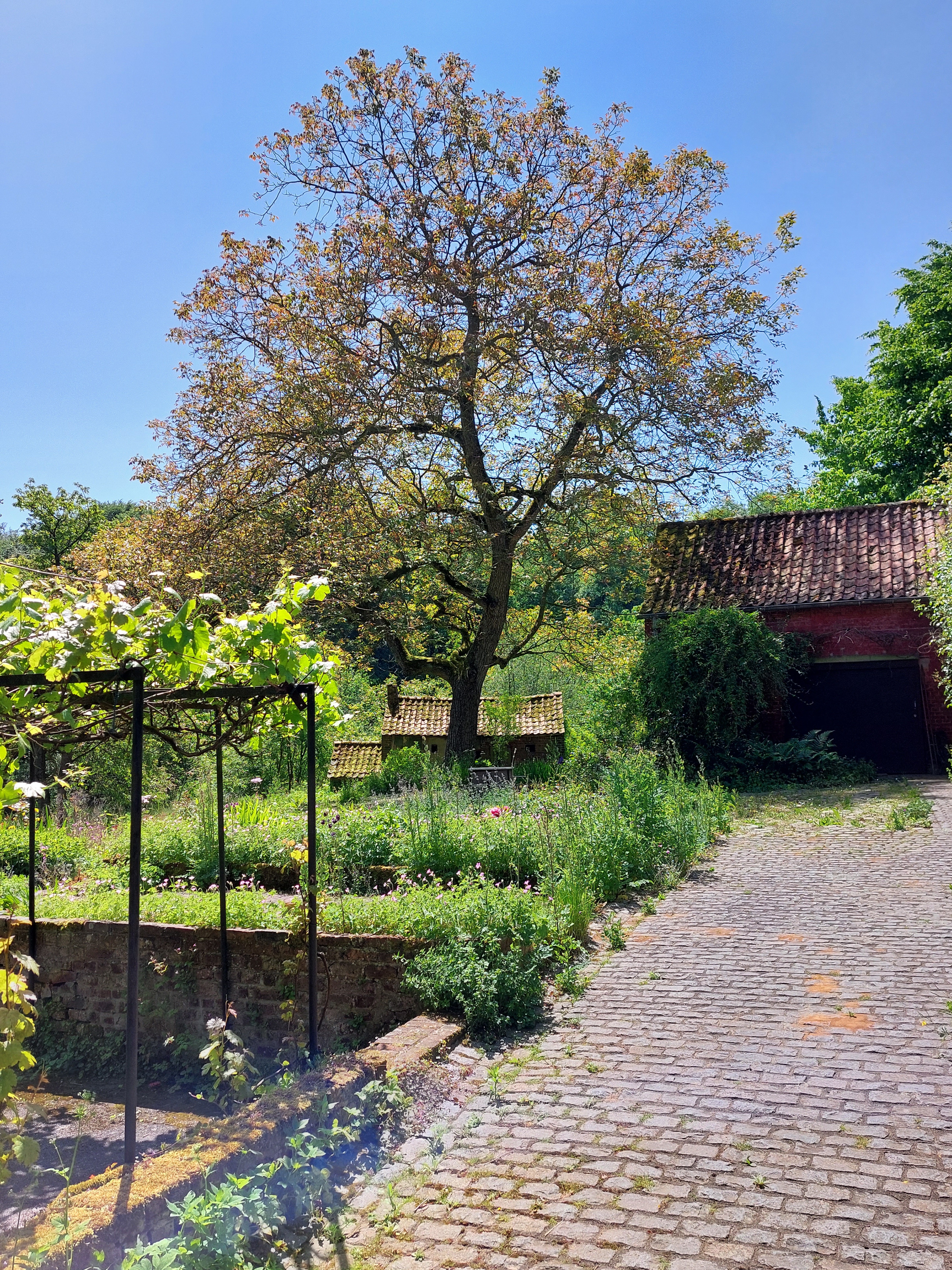 De afbeelding 'Notelaar op erf' gemaakt door Smets, Koen wordt ter beschikking gesteld door Agentschap Onroerend Erfgoed (AOE) onder de volgende voorwaarden: Modellicentie voor gratis hergebruik, Naamsvermelding-GelijkDelen 4.0 Internationaal.