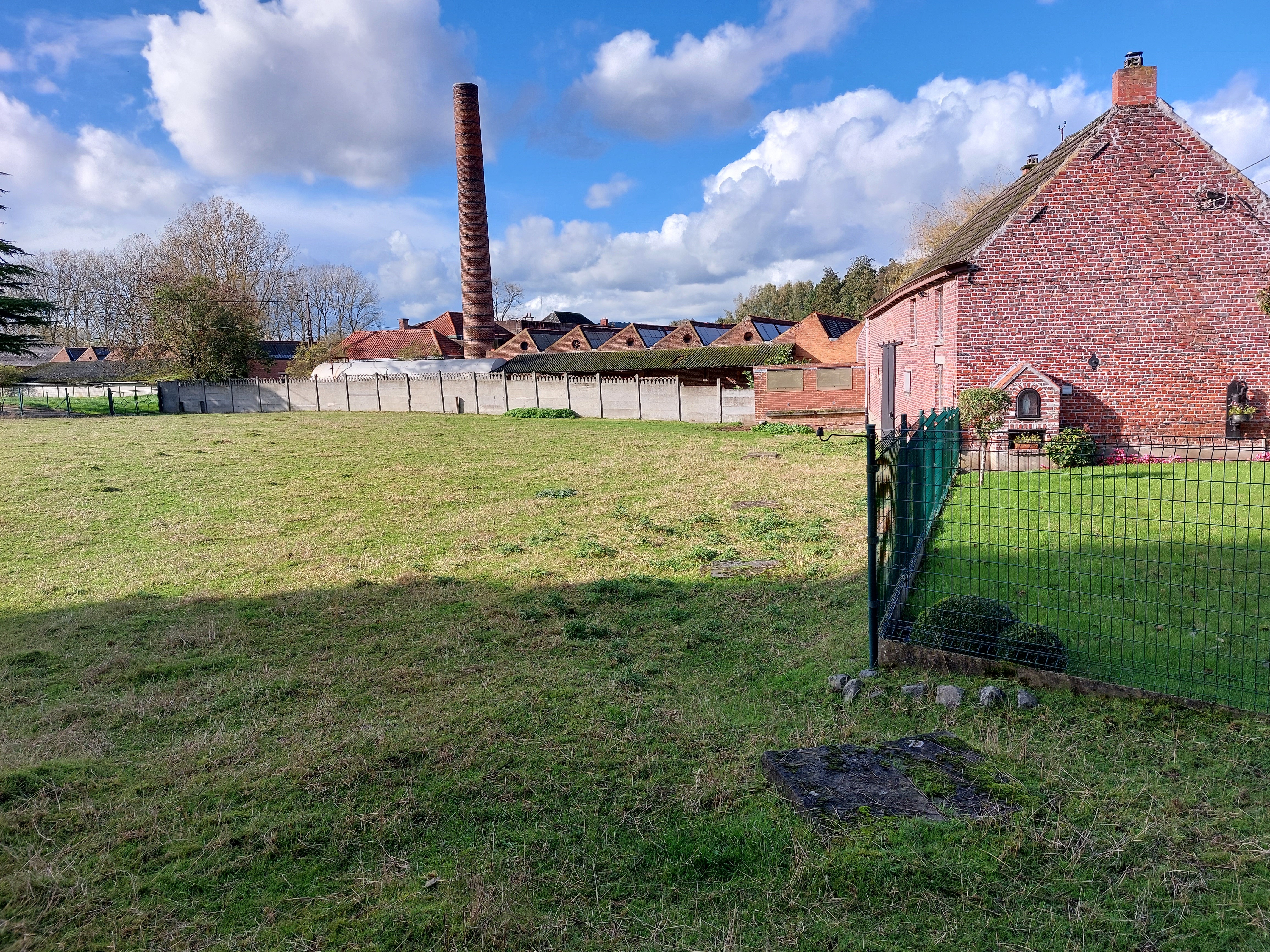 De molenbeek is hier ingebuisd. Merk de putdeksels in het grasland op. Voormalige verffabriek in de achtergrond.