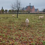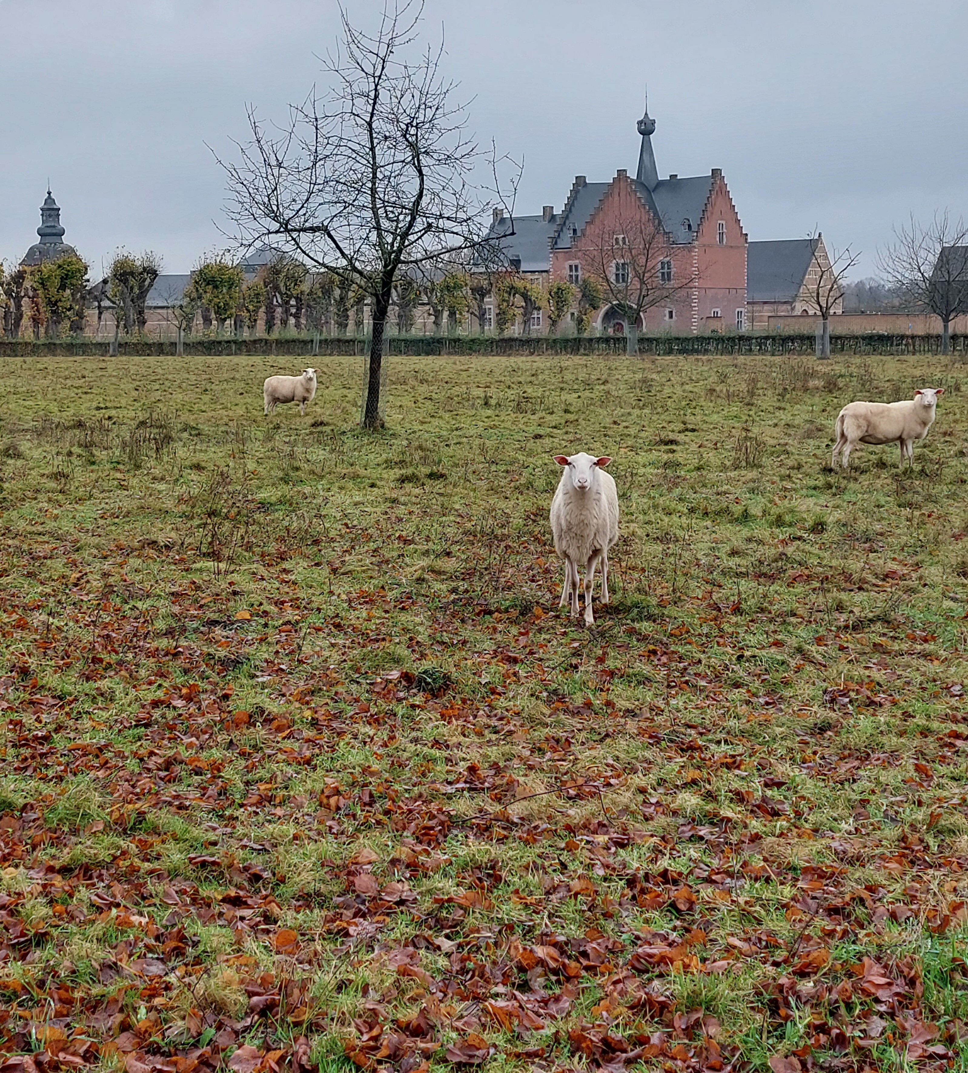 Nieuw aangeplante boomgaard bij de abdij van Herkenrode, met het 17de-eeuwse poortgebouw en de dubbele lindendreef in de achtergrond.