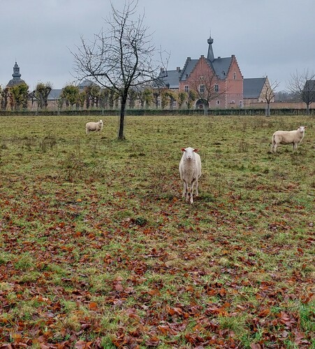 Nieuw aangeplante boomgaard bij de abdij van Herkenrode, met het 17de-eeuwse poortgebouw en de dubbele lindendreef in de achtergrond.
