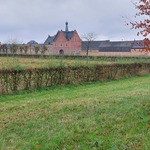 Zicht op het poortgebouw (centraal), de paardenstalling (rechts) en het neerhof (links). De hagen en boomgaard zijn nieuwe aanplanten.