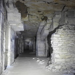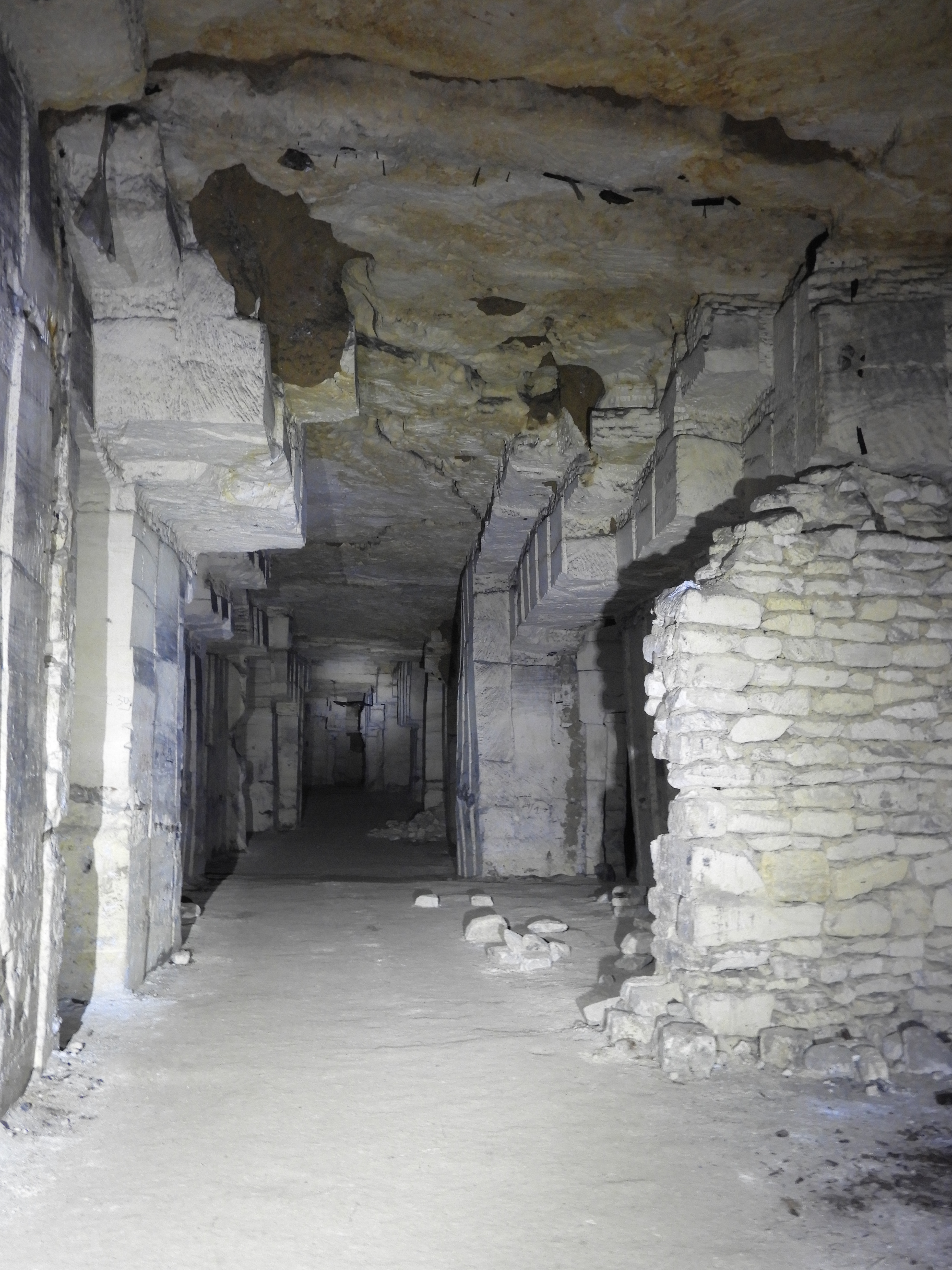 Ondergronds landschap met muurtje van mergelstenen en enkele aardpijpen op het plafond.